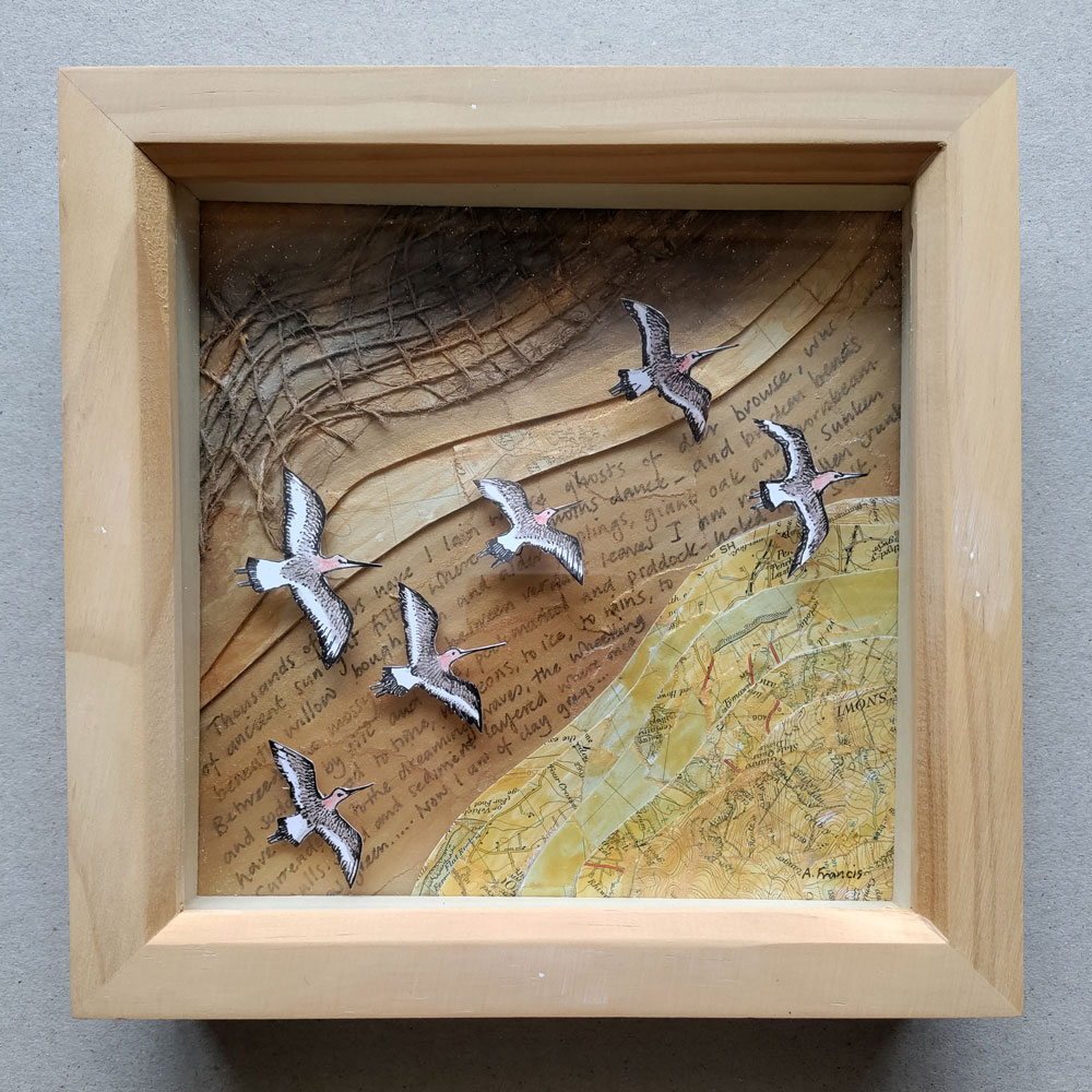 Also up on the wall are Redshank, a papercut layered picture in pen and ink and watercolour pencil and Over the Mudfalts, a mixed media artwork with little flying black tailed godwits positioned on thin wires: