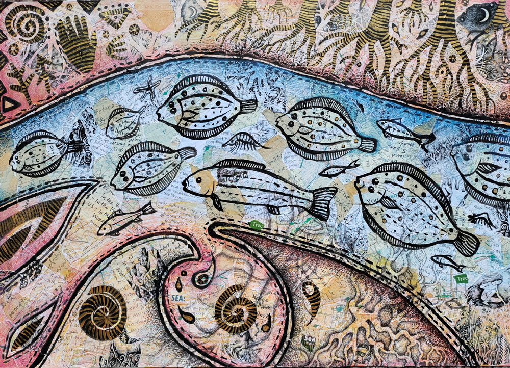 I was curious about the channels between the mudflats, what fish came in with the incoming tides? Dabs? Between the Tides is an experimental image that doesn’t quite work from a composition point of view, but it was interesting to play with mixed media – collage, pen and ink, acrylic paint and watercolour pencil.