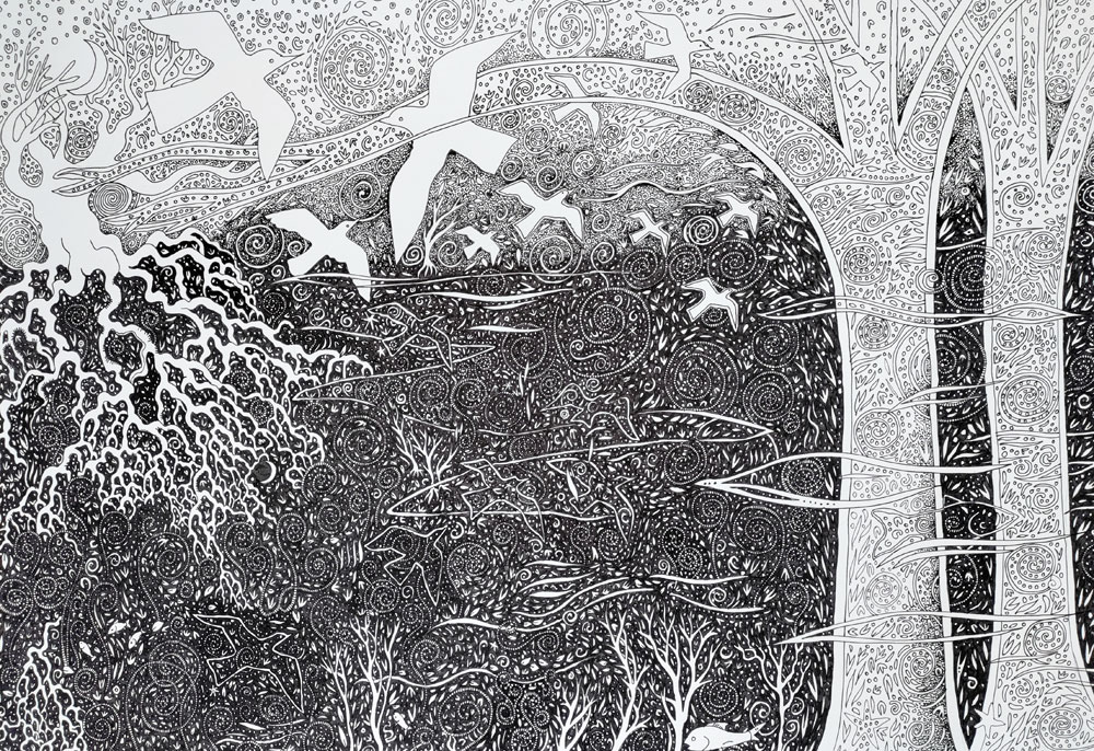 Two pole like trees tower over a star-encrusted shore where gulls dance. Lost to the Sea refers to the forests that once fringed the coast, but disappeared when the sea rose and the UK became an island about 8,000 years ago.