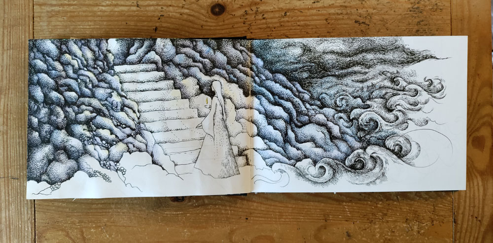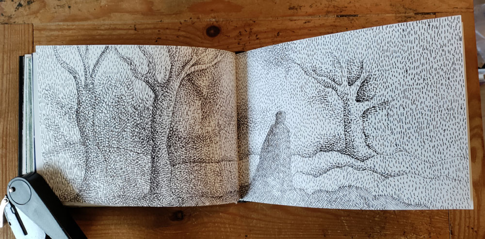 While perusing Instagram I stumbled on the work of the artist Lynda Jones. I was immediately impressed and inspired to try and improve my pen and ink work. Below I’m working in one of my sketchbooks with the intention of washing it with watercolour when I get it back from the exhibition. Check out Lynda’s beautiful drawings here.
