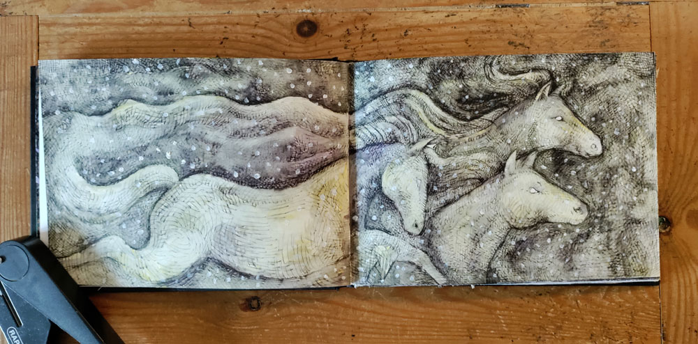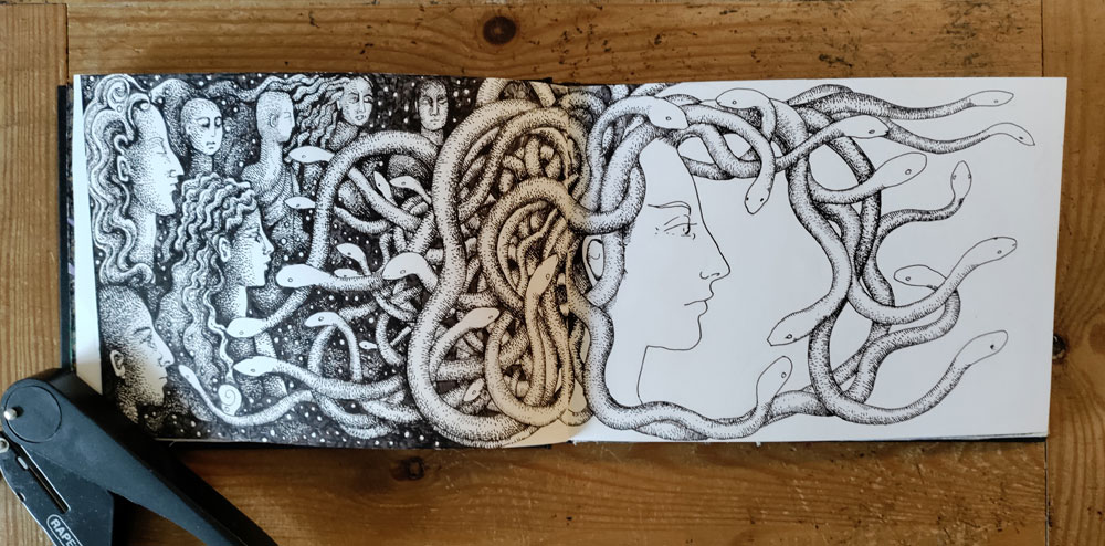 And here are a few pages from my other sketchbook entry – they include a Medusa, A Long Man giant, a river goddess, horses inspired by cave paintings (it is the Year of the Horse…) and various random illustration experiments: