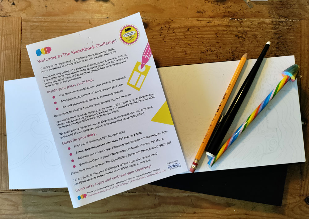 Earlier this year I visited the Crypt Gallery here in Seaford and was delighted to see an exciting exhibition of sketchbooks by local people. This was the result of the 2024 SCIP (Sussex Contemporary Illustrators and Printmakers) Sketchbook Challenge. I decided that I’d like to take part in this year’s challenge.