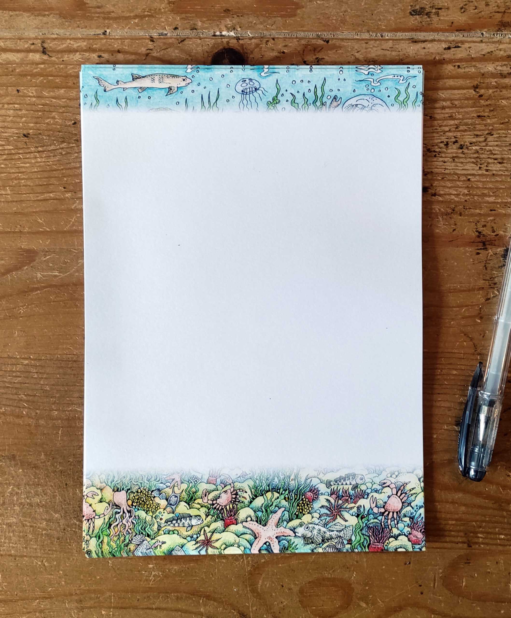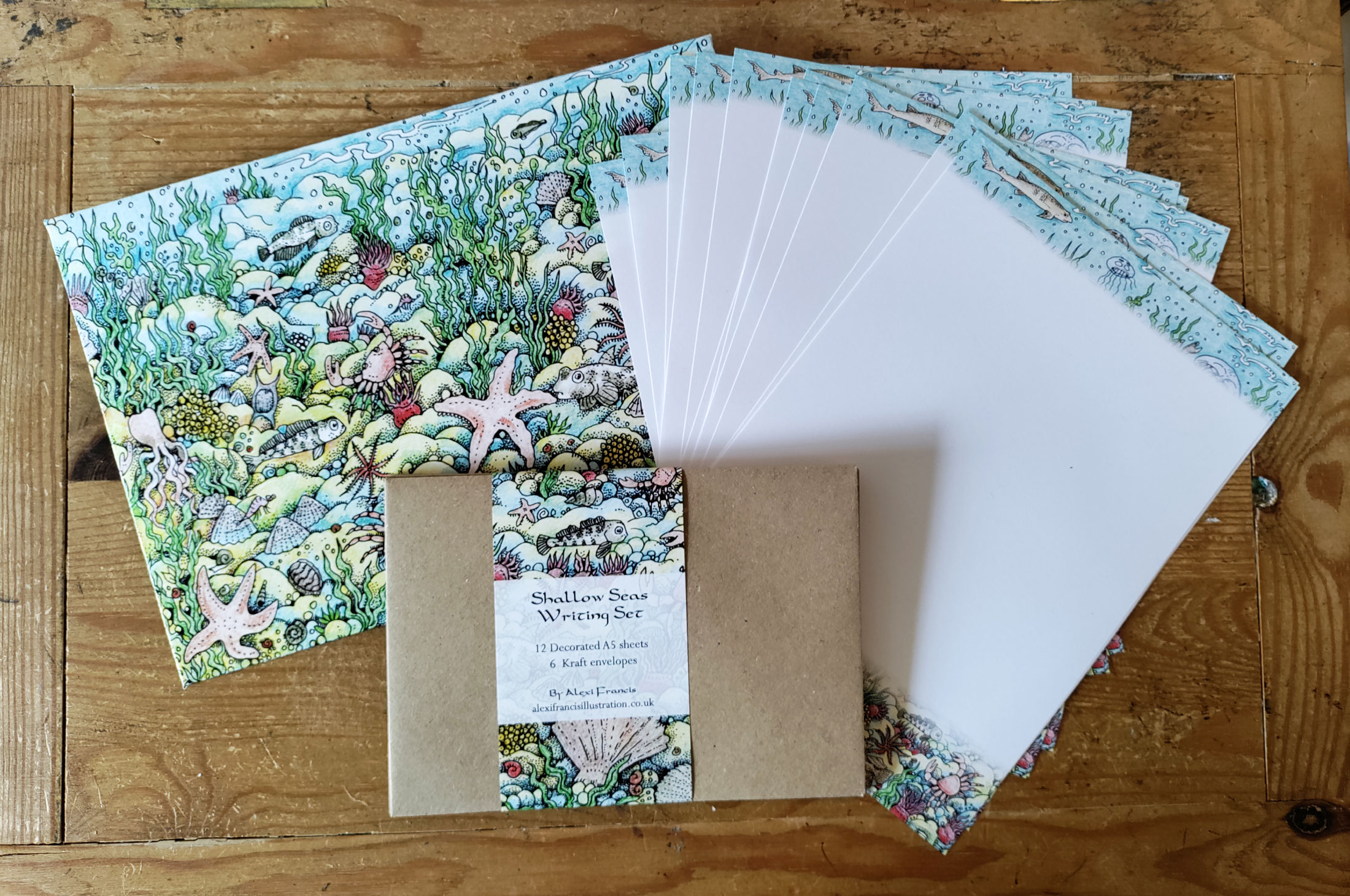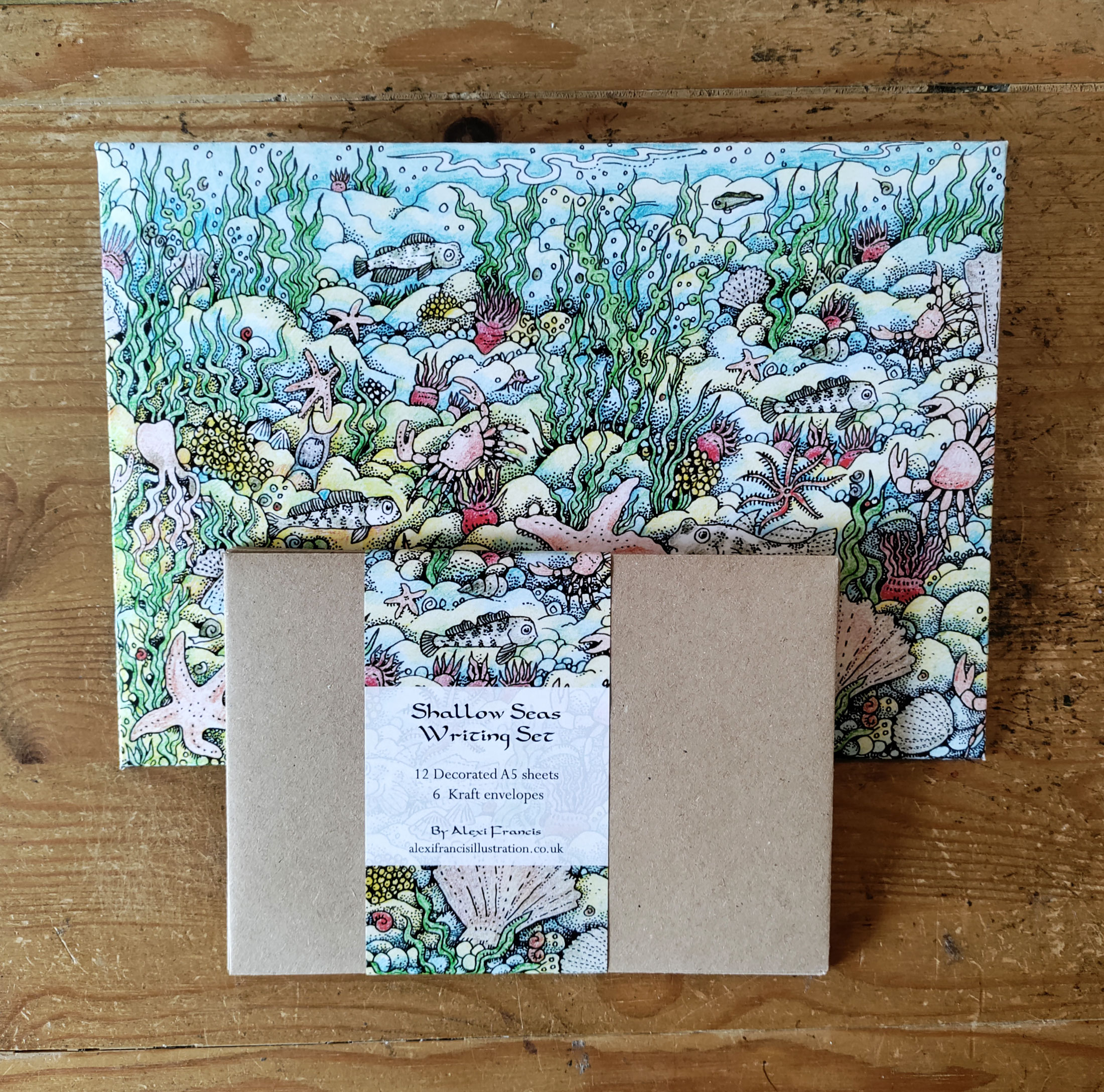 The Shallow Seas Writing Set includes 12 sheets of quality 120gsm A5 writing paper, with an illustrated border on one side featuring sea creatures, and 6 kraft envelopes. The paper and envelopes come in a larger handmade envelope featuring a detailed shallow sea scene with starfish, blennies, crabs and other sea creatures.